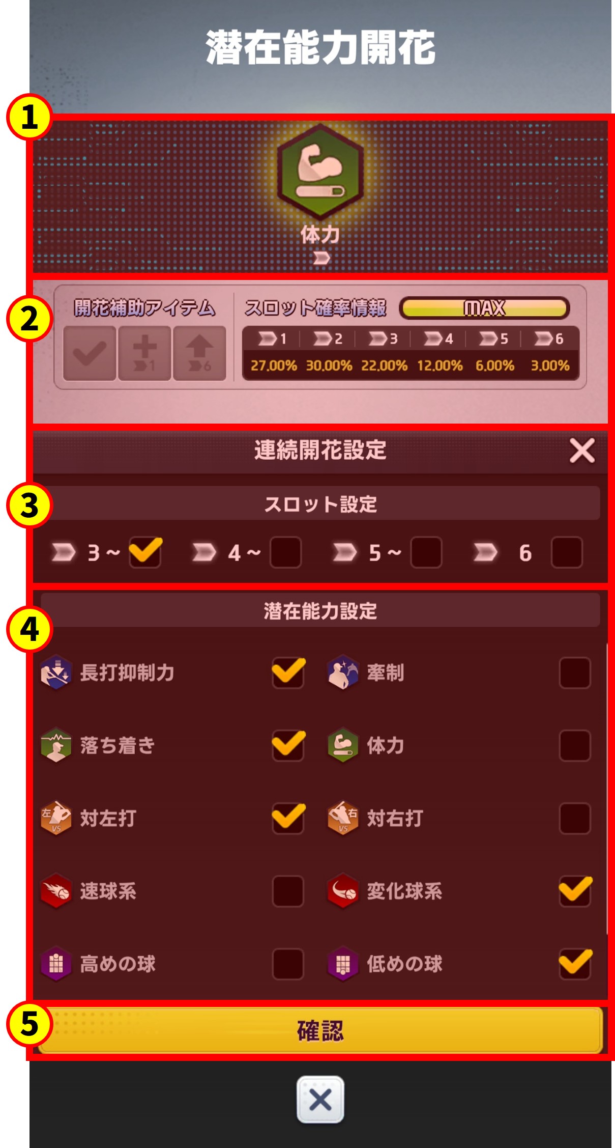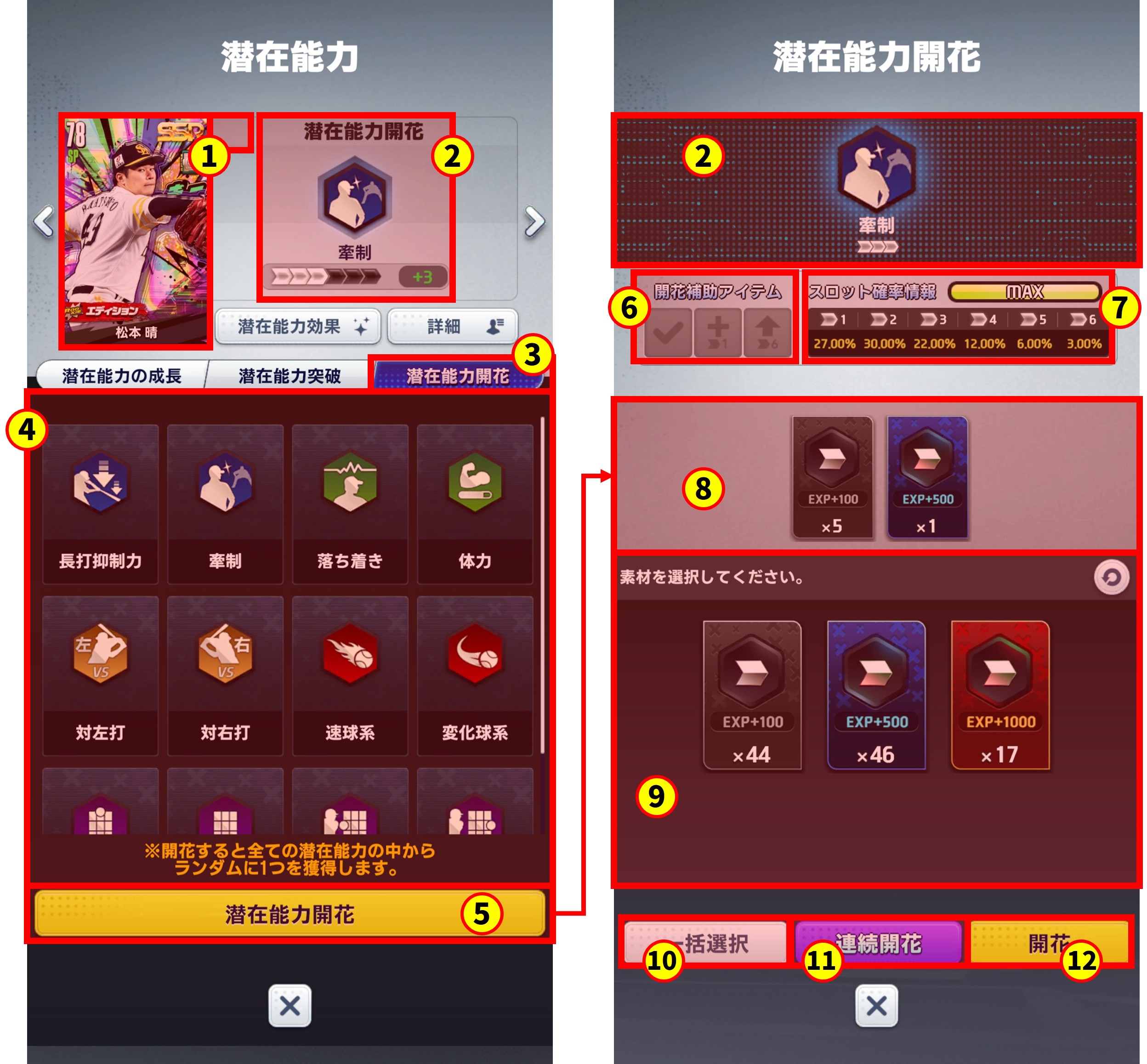 - 潜在能力を開花させると打者、投手のそれぞれの潜在能力の中から1つをランダムに獲得できます。